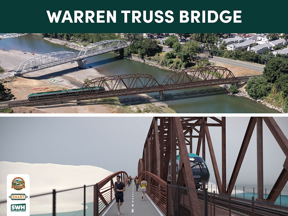 One significant upgrade along the route is the railroad bridge over the Russian River, only about a quarter mile from the station location. Monday’s meeting, held at the Abel de Luna Community Center, was the first opportunity for the Healdsburg community to see, and to some extent weigh in on, the bridge.