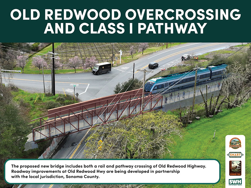 The renderings included both rail and passenger walkway, part of the SMART-wide “Pathway” that will link with Healdsburg’s own Foss Creek Trail and, eventually, the Great Redwood Trail project that extends to Eureka. The SMART Pathway is projected to be a dedicated route for people to walk, bike and roll safely within and between communities.