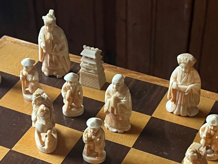 Photo by Pierre Ratte BATTLE ZONE The chess set pictured here is made of handcarved ivory from post-war Japan, circa 1950, representing Buddhist monks as bishops and mounted samurai as knights. The castle design is also Japanese.